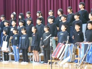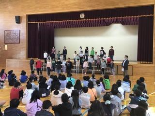 委員会の引き継ぎの後,各学年から歌や楽器の演奏,ダンス,寸劇などの出し物がありました。名取が丘校の在校生の皆さんから不二小の卒業生へプレゼントもいただきました。最後に,6年生から在校生に向けて歌のプレゼントがありました。