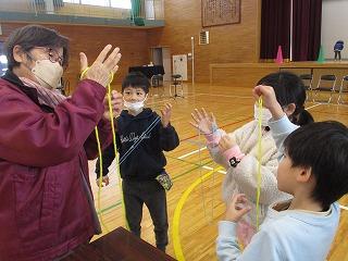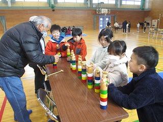 2月8日(木)に,1年生の生活科の学習で,昔あそびを体験しました。地域に住む16名の方が昔あそびの講師として来てくださり,子どもたちにあやとりやだるま落とし,こま回しなどの遊び方を教えてくださいました。子どもたちは興味津々に講師の先生方のお手本を見たり,教えてもらいながら練習したりと,楽しそうに活動することができました。今後は雨の日の室内遊びとして,昔ながらのおもちゃに親しんでいきます。