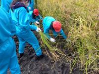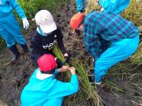 昨日の雨の影響もあり、田んぼはぬかるみがちでした。おしりが泥だらけの人も・・・。