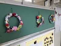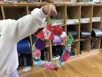 子供たちが作ったリースが完成しました。銀色の輪に思い思いの飾りを付けて、オリジナルのリースができました。あおぞらの廊下に飾った後、持ち帰ってご自宅で飾ってもらいます。