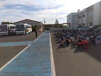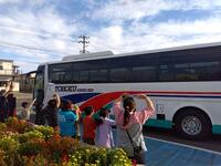 体育館前の駐車場に並ぶバスを見て、登校してきた1~5年生も行きたそうです。