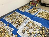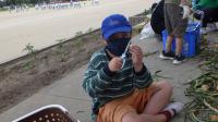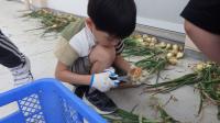 収穫したたまねぎの葉と根を切る作業を行いました。大きなたまねぎと小さなたまねぎ、中くらいのたまねぎに分けて、分担して作業を進めました。野菜市場へ向けて、一つ準備が進みました。