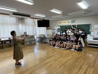 2025年7月18日 11時50分夏休み前朝会では、みんなのために働いている給食委員会の皆さんの紹介がありました。