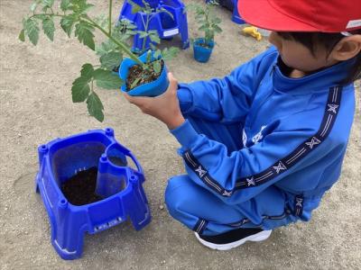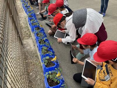 土入れの後,苗をそっと鉢に入れ,思いを込めて植えました。じっくり見たり,タブレットで写真を撮ったりして観察していました。