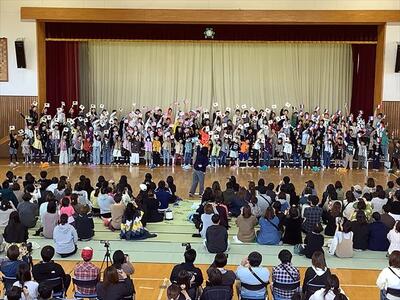 『世界旅行』をテーマに、「小さな世界」「オー・シャンゼリゼ」「ふじ山」「世界中の子供たちが」の合唱、「せいじゃの行進」の合奏を発表しました。