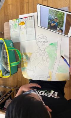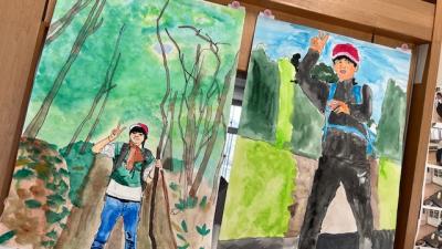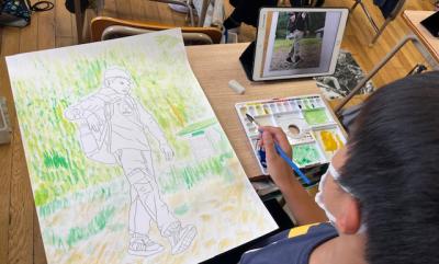 その時の写真を拡大コピーして画用紙の上から輪郭をなぞり、写実的に描いています。