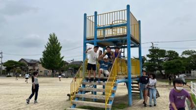 掲揚塔の土台をうまく使って竹馬(鉄馬)に挑戦中。